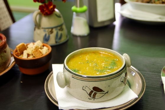 Cred că supele puternic aromate le-ar fi venit de hac până și celor mai sceptici la adresa mâncării vegetariene care declară că “nu are gust”. Din păcate nu am reținut toate mirodeniile supei, pentru că meniurile ne-au fost smulse mult prea repede de sub nas, iar de cerut nu le-am mai cerut înapoi.