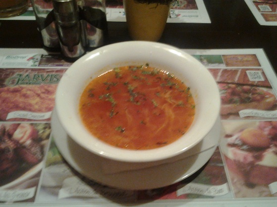 După o lungă aşteptare ajunge şi supa la masă, într-o porţie mică, cât să nici nu-ţi dai seama că ai mâncat ceva şi partea proastă e că avea un gust de apă chioară (dar roşiatică) cu tăieţei. Deosebit!