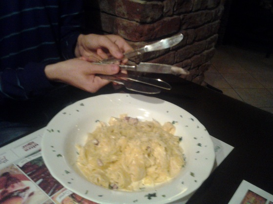 Nici pe Stan nu l-au impresionat prea mult pastele, dar măcar a putut alege cu ce să le savureze. I-au fost aduse 4 cuţite mari şi frumoase, la ce ar putea avea nevoie de o furculiţă? De sosul pastelor nu prea a fost el mulţumit, spunând că ar fi avut un gust destul de ciudat, iar întreaga experienţă l-a costat 18 lei, deloc ieftin.