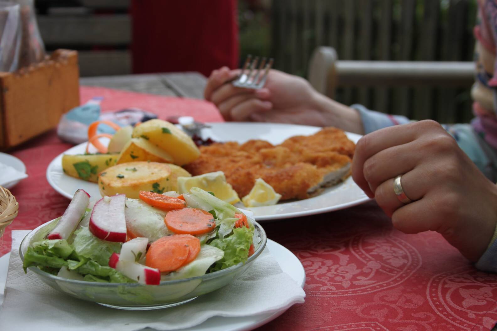 - şniţel vienez de vită cu garnitură de cartofi prăjiţi, dulceaţă de fructe de pădure şi salată separată (toate incluse, nu am comandat carne, pe urmă garnitură, pe urmă salată) – 12 euro