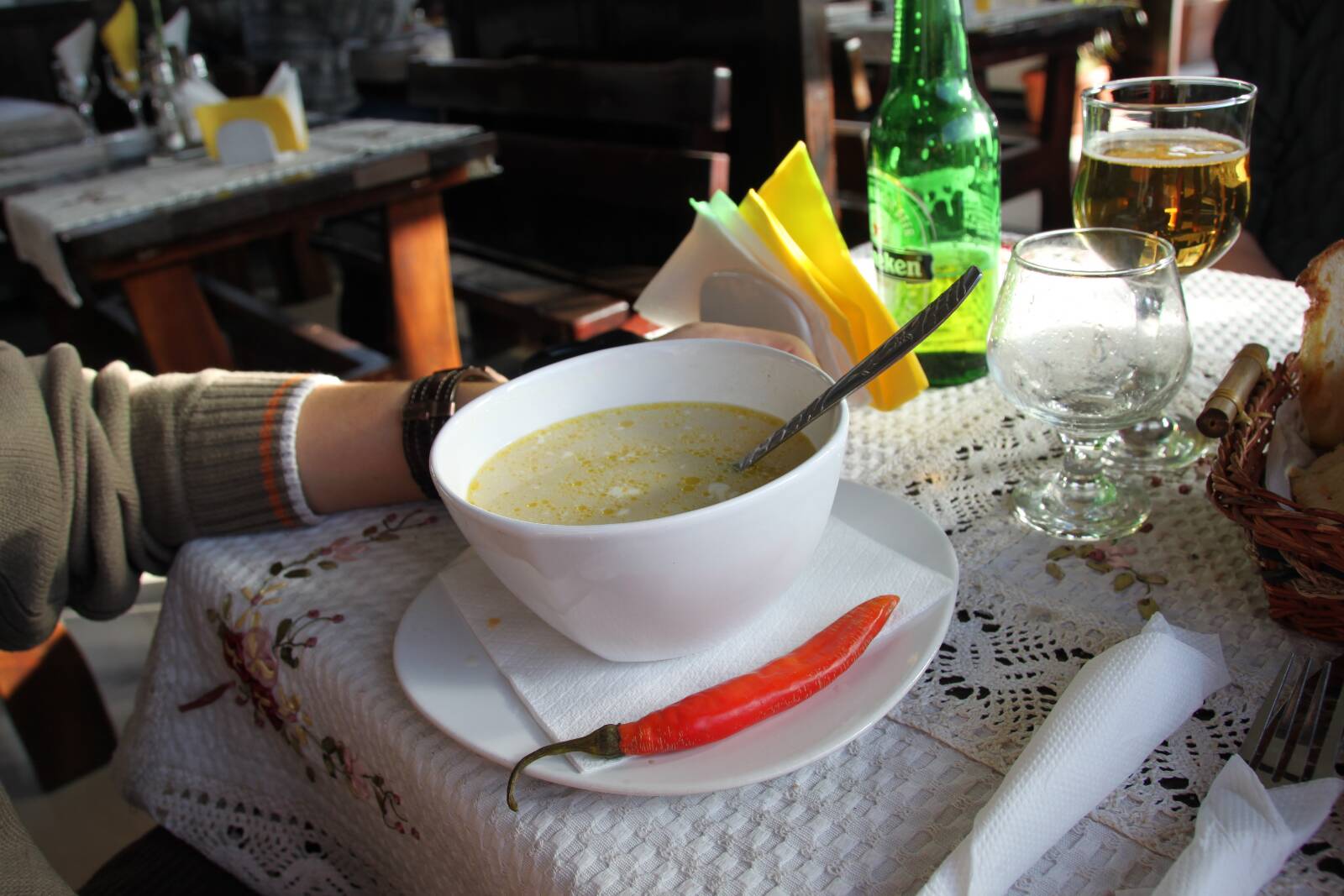 - O ciorbă de burtă pe care am împărţit-o cu dnul. V. Ciorba avea ardei şi smântână şi a fost foarte bună, fără să fie grasă – 8,5 lei + smântâna 2 lei;