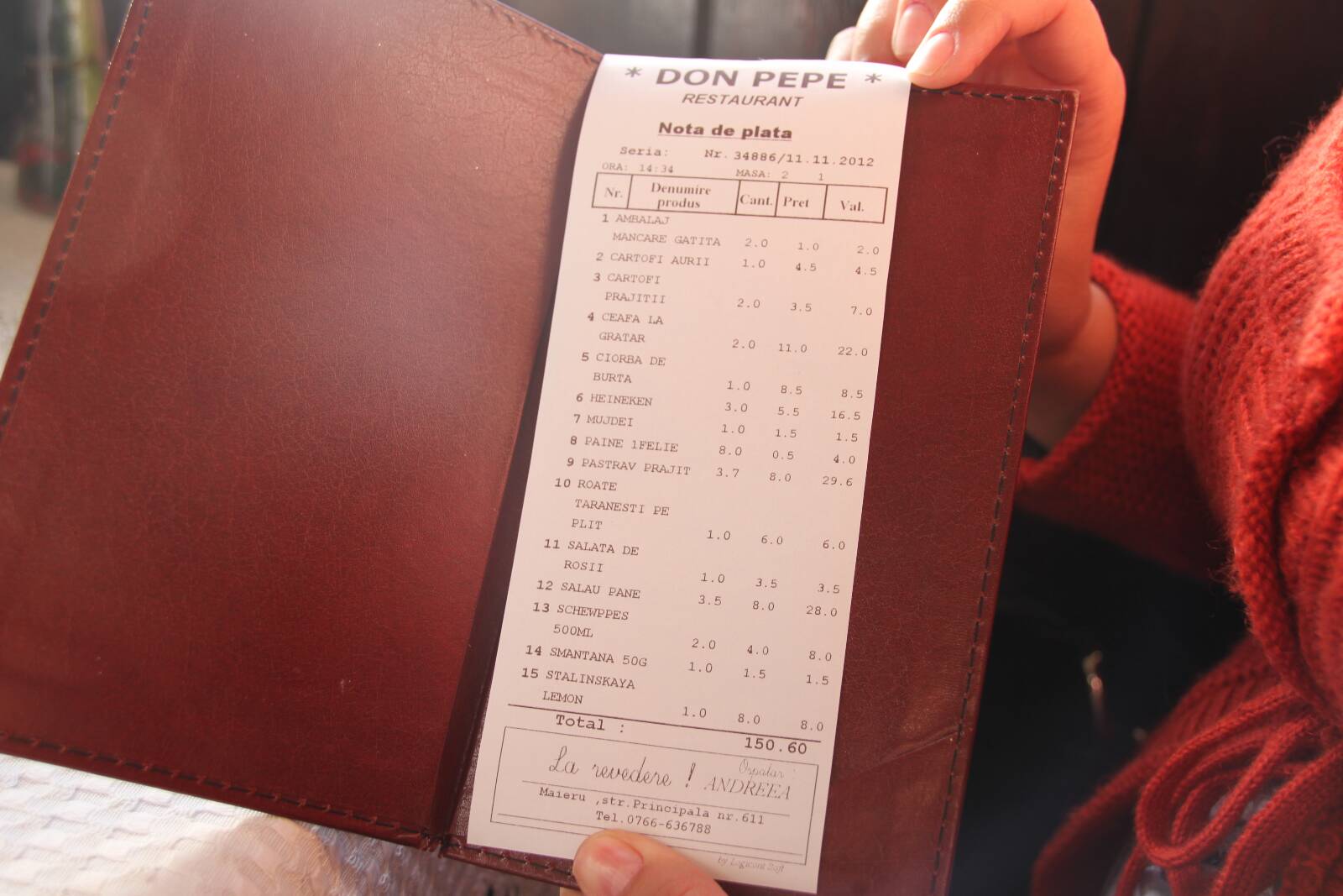 Despre porţii trebuie să spun că au fost întotdeauna foarte mari: shaworma mică poate sătura orice bărbat în putere, cea mare fiind destinată, probabil, uriaşilor. Păstrăvul meu a cântărit aproape 400 g, iar şalăul cam 350 g. Deci, am luat cam jumătate la pachet în casolete termice cu sistem adecvat de închidere, astfel încât am avut şi cina asigurată. Per total, prânzul ne-a costat 150 lei (+ bacşiş), un preţ rezonabil, cred eu.