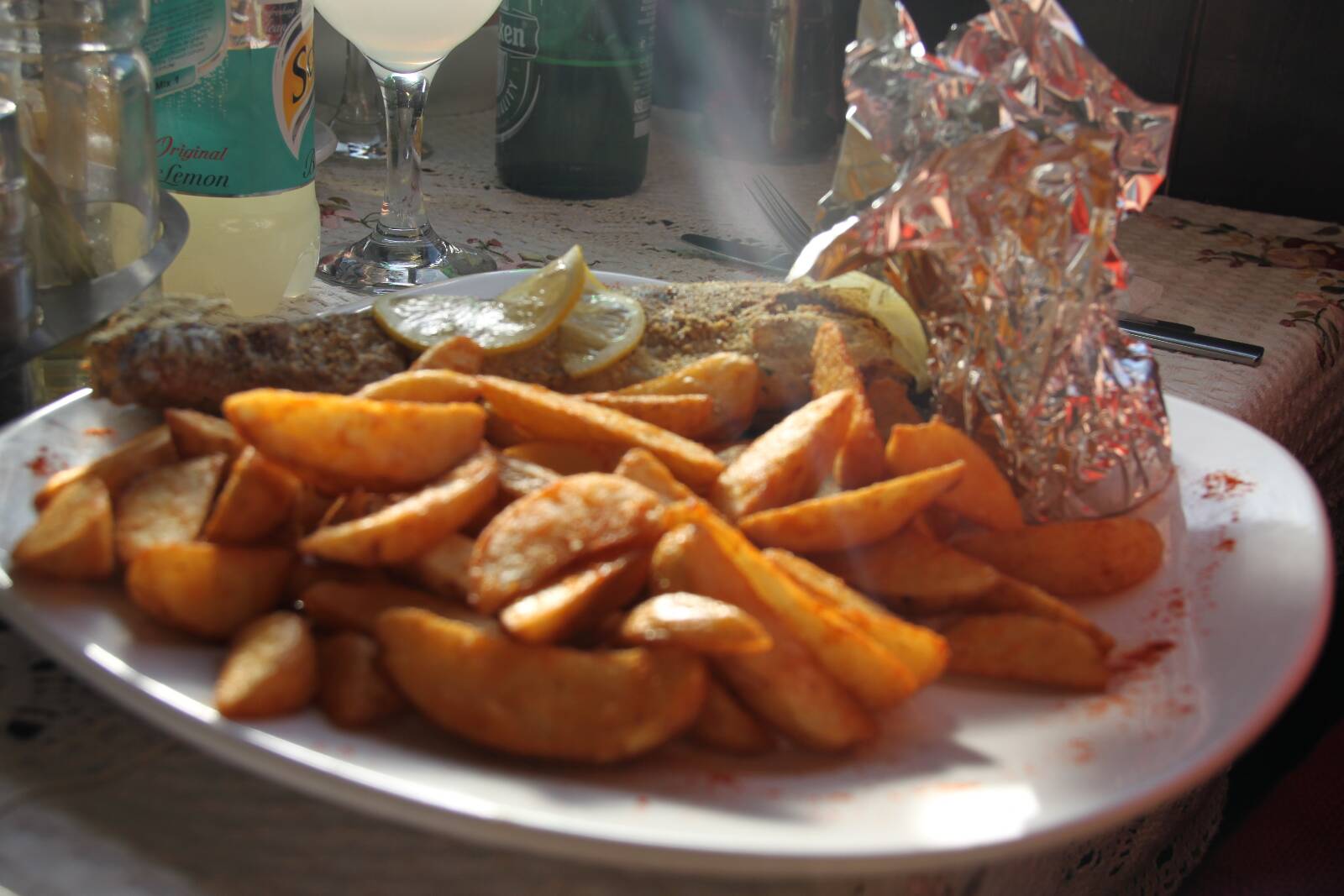 - O porţie de şalău pane cu roţi de cartofi făcute pe plită (fără ulei), despre care dnul. V a spus ca au fost foarte buni (cartofii şi peştele) – 8 lei / 100 g + 6 lei;