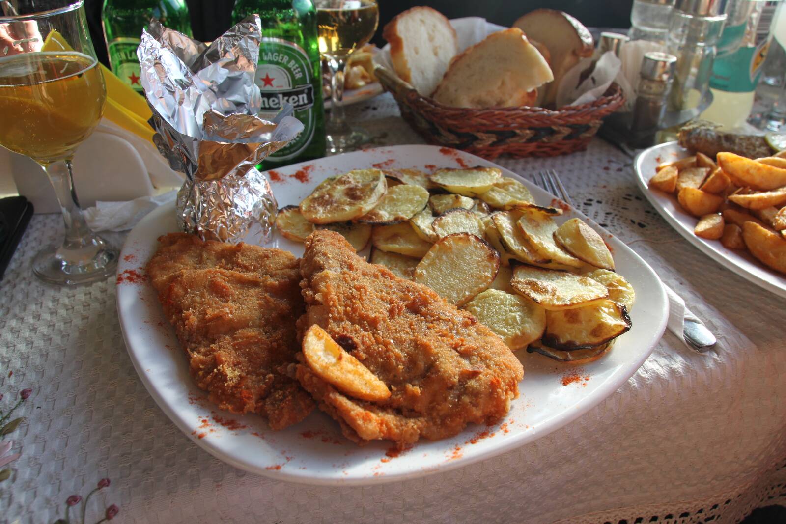 - Două porţii de ceafă la grătar cu cartofi prăjiţi şi o salată de roşii, socrii spunând că au fost foarte bune – 11 lei / porţia de 200 g + 4 lei;
