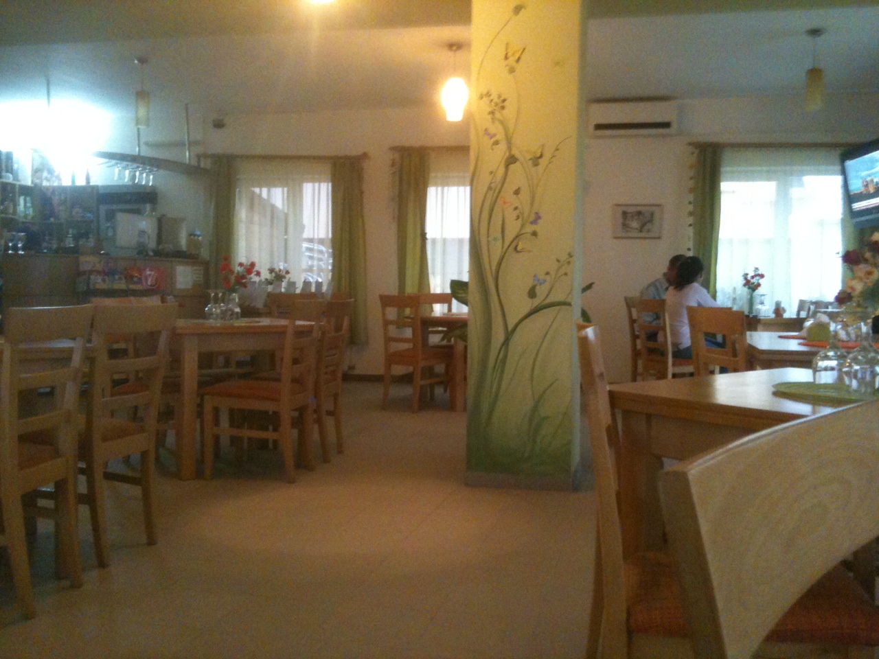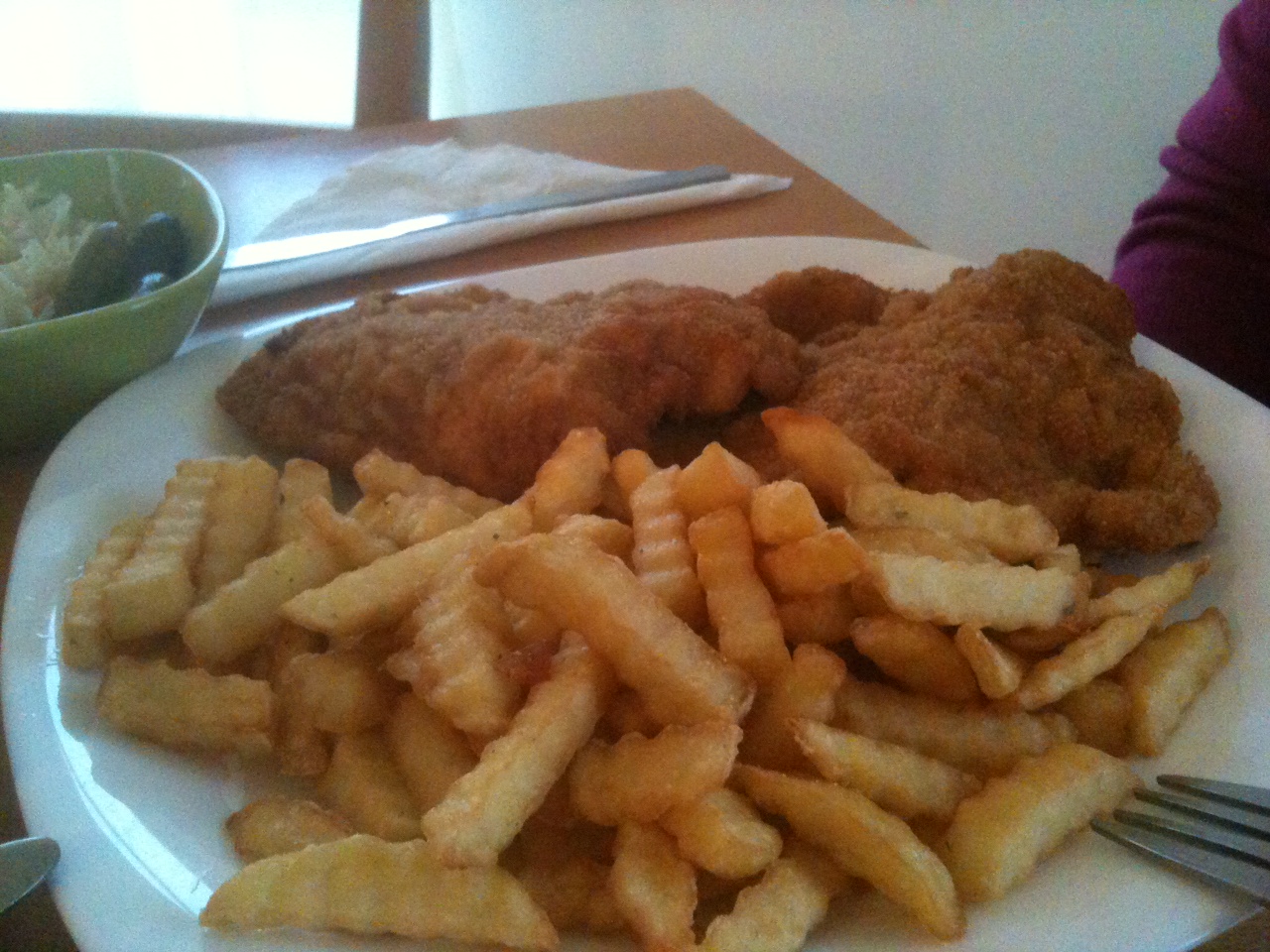 Mâncare a venit destul de repede pentru că nu erau decât vreo două mese ocupate în afară de a noastră, şi a fost foarte bună, porţiile fiind uriaşe. În afară de faptul că nici şniţelul şi nici cartofii prăjiţi nu aveau sare, totul a fost ok, ingredientele erau proaspete şi mâncarea era gătită bine.