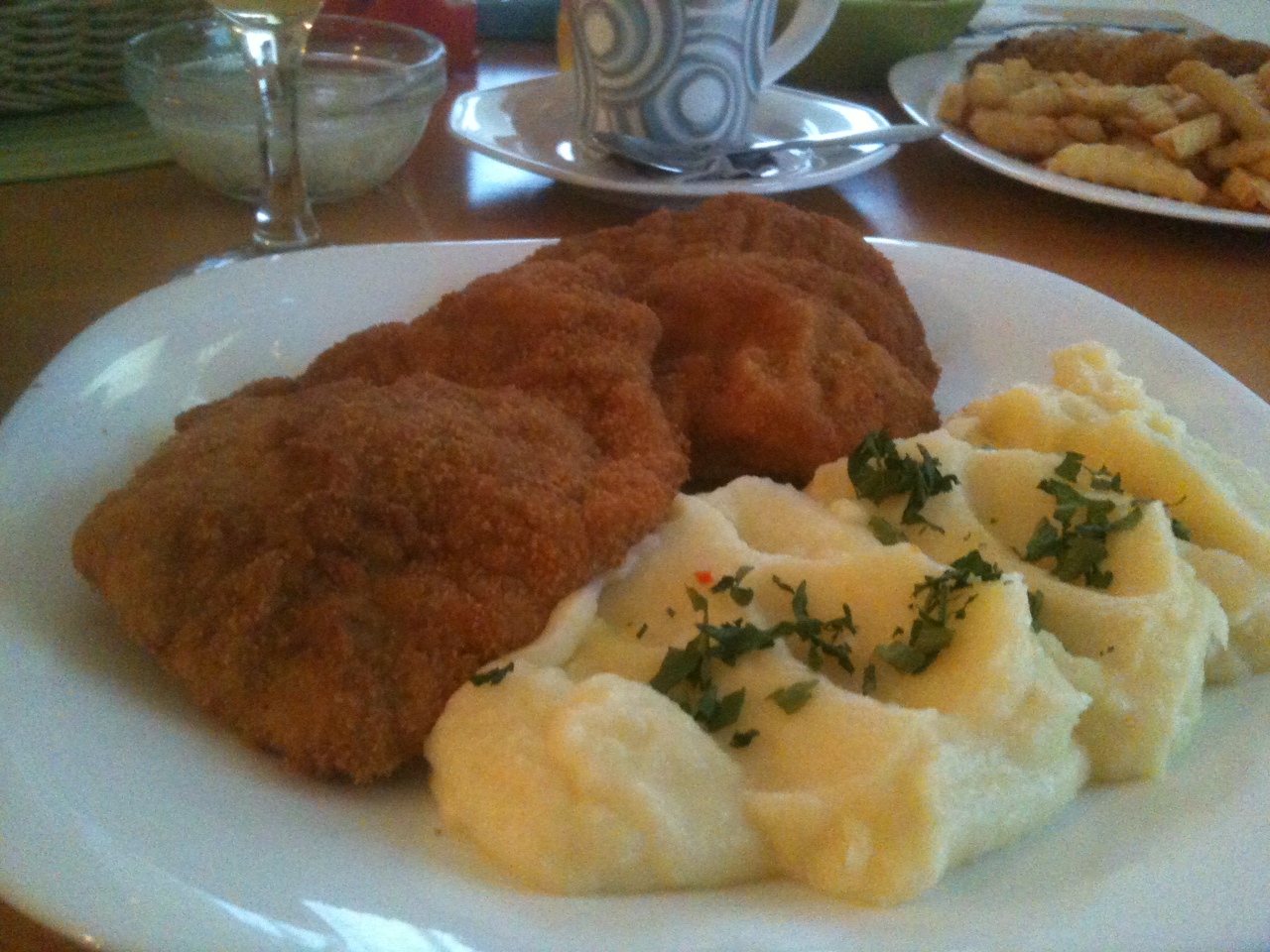 După consultarea meniului care e destul de bogat, ne-am comandat câte un şniţel de porc gigant cu garnitură de cartofi prăjiţi pentru mine şi piure pentru el. Ca fapt divers, pe lângă meniul zilei întâlnit peste tot, acesta conţinea pizza. Problema era însă că din păcate, nu se prepara zilnic aşa că noi am mers pe opţiunile mai sus menţionate.