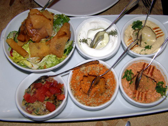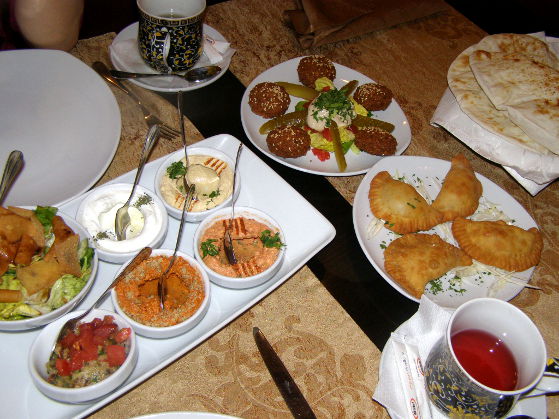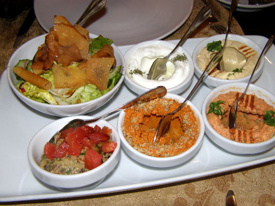 Mâncarea libanezǎ nu ne era, nici mie, nici prietenei însoţitoare, necunoscutǎ, dar cum nu mai avusesem prilejul de a o gusta de ceva timp, ne-am orientat cǎtre preparate specifice şi larg cunoscute. Am optat ca toate felurile sǎ vinǎ în acelaşi timp, o regulǎ în cazul meselor sociale specifice popoarelor mediteraneene.
