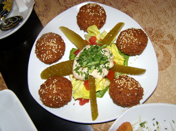 Celǎlalt preparat de la masa noastrǎ a fost genialul falafel (14 lei), adicǎ cinci chifteluţe calde din pastǎ de nǎut, ceapǎ şi usturoi, însoţite de castraveţi acri şi salatǎ, o îmbinare reuşitǎ şi aromatǎ, foarte pe placul papilelor noastre.