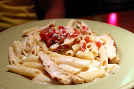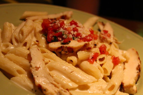 Partenerul a ales pentru cină paste cu 3 tipuri (mozzarella, provalone și parmezan) de brânză, roșii, busuioc și piept de pui la grătar, totul mixat cu sos Alfredo. De arătat, arată ca-n poză, dar n-am idee să vă zic cum au fost pentru că eu am fost extrem de plină ca să mai testez și din alte farfurii. 😀