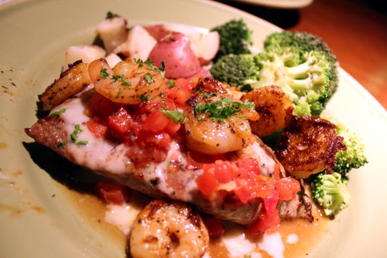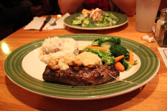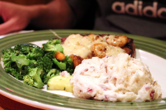 Partenerul nu a vrut nimic light așa că a ales o friptură cu creveți, broccoli și pireu. A fost delicios, excluzând pireul care are urme de cârnăciori prin el.