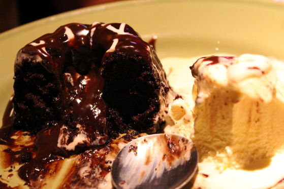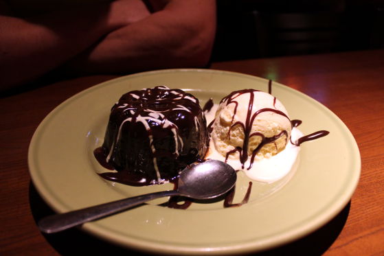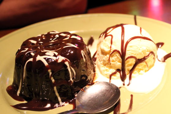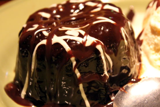 Pe langă faptul că arată într-un mare fel, a fost și foarte bun. Practic e vorba de o prăjitură de ciocolată cu interior lichid, tot de ciocolată care “erupe” de îndată ce servești prima bucățică. Este servită caldă, alături de o cupă de înghețată de vanilie și cu topping de ciocolată deasupra.