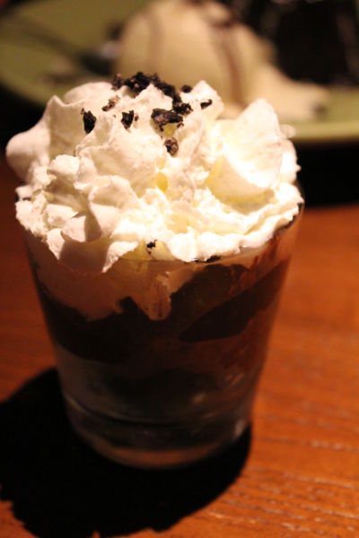 Dacă am avut o cină light (eu cel puțin), am zis că merg niște deserturi. Eu am ales un desert mic de tot cu chocolate mousse și frișcă, iar el a comandat un desert numit Tripe Chocolate Meltdown. Dacă de a meu nu sunt prea multe de spus că doar toată lumea știe ce e cu chocolate mousse-ul, despre desertul lui ar fi multe de zis.