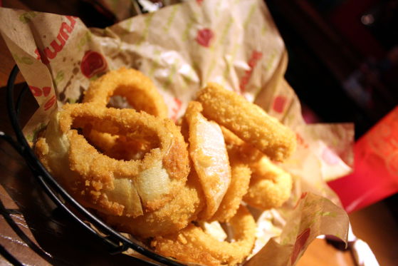 Meniul e stufos, dar a ajutat faptul că ne era foarte foame astfel că nu ne-am pierdut foarte mult timp cu asta. Fiecare și-a luat un aperitiv: John aripioare de pui cu sos de barbeque și eu inele de ceapă. Știți voi că de ceva vreme caut prin Timișoara inele de ceapă bune de tot, dar nu am avut până acum noroc. Nici de data asta nu a fost să fie. Am nimerit niște onion rings bleguțe, deloc crocante și mega fierbinți.