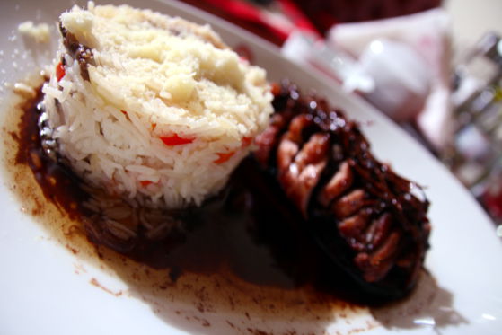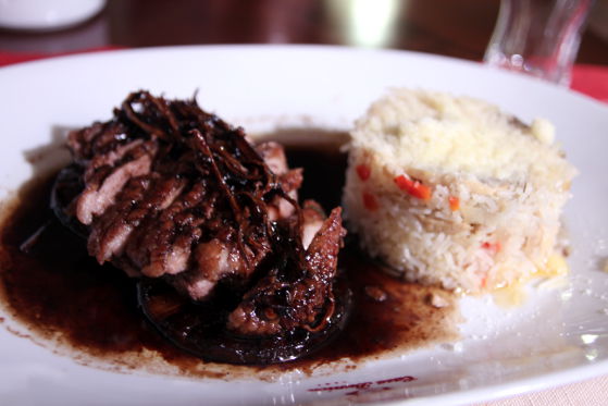 Piept de rață cu ananas și orez cu ciuperci și cașcaval a fost alegerea mea și mă bucur tare că v-am ascultat. După cum spune Bunica în meniu, și pentru că eu nu aș putea să o spun mai bine, pieptul de rață se crestează și se trage puțin la tigaie, apoi se dă la cuptor cu grijă ca să păstreze un interior roz și fraged. Ananasul se dă la tigaie în puțin unt, se adaugă puțin zahăr, ghimbir, chilli, miere și se stinge cu oțet balsamic, compoziția fiind așezată pe cele două bucăți mari de ananas. Un deliciu, și nu exagerez deloc. Pieptul de rață era roz, moale și foarte suculent, iar combinația de gusturi care mai de care mai interesante se completau reciproc întru-un mod perfect. Oțetul balsamic cu a sa aromă puternică, în combinație cu mierea dulce și cu gustul pronunțat de ghimbir de deasupra, m-au făcut să cred că cele 350 de grame de carne nu sunt de ajuns. 😀