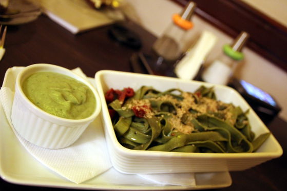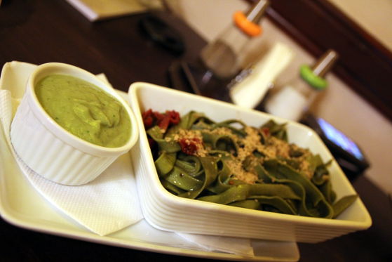 De data aceasta mi s-a pus pata pe paste cu roșii uscate și sos pesto. În meniu zicea așa: paste integrale, roşii uscate, pesto, parmezan vegetal, ulei de măsline. Nu mai mâncasem paste integrale până la acel moment așa că eram curioasă să văd cum arată, ce gust au și care e diferența între pastele cu care eram eu obișnuită și varianta mai sănătoasă a acestora. Când au ajuns și le-am văzut atât de verzi în farfurie (cred eu că erau cu spanac) trebuie să recunosc că am fost puțin reticentă și credeam că mi-am cam compromis prânzul.