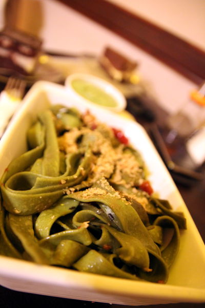 Bineînțeles că mi-am dat seama că greșesc în momentul în care le-am gustat. Singura diferență majoră pe care am remarcat-o e că aceste paste sunt parcă mai sățioase decât cele cu care eram eu obișnuită. Roșiile uscate erau tare bune la gust, iar parmezanul vegetal de deasupra a dat un gust interesant combinației. Un singur lucru aș avea de spus, cred că au avut puțin cam mult ulei de măsline pentru gustul meu. Nu a fost neapărat un lucru rău, dar pastele de jos se scăldau în puțin cam mult ulei. Nici sosul pesto nu m-a dezamăgit deloc. Un sos răcoritor și ușor care a făcut ca pastele să fie savurate până la ultima îmbucătură.