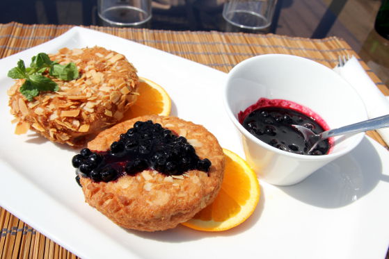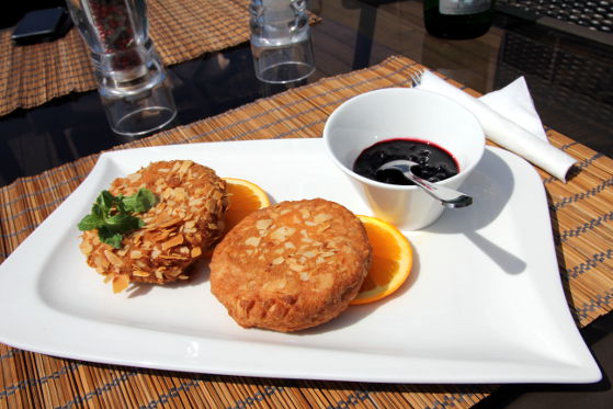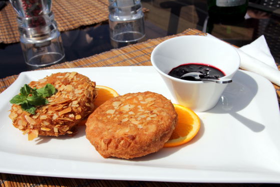 Cu toate că brânza camembert în crustă era trecută în meniu la aperitive calde, eu am solicitat să fie servită după supă, ca desert. La vederea platoului cu cele două bucăți de camembert auriu și sosul de afine alături, am știut că mă va cuceri. Mie oricum îmi place din start orice combinație neobișnuită de sărat-dulce-acrișor, așa că abia așteptam să degust minunăția din fața mea. Camembertul, unul din cele mai cunoscute tipuri de brânză franțuzească, nu e foarte sărat, are o consistență cremoasă și fină, deci se potrivește foarte bine pentru astfel de mâncăruri. Cele două felii de camembert erau îmbrăcate într-o crustă cu felii de migdale și erau rumenite bine pe ambele părți. Așezate pe două felii proaspete de portocală, cu sosul de afine alături, arătau îmbietor.