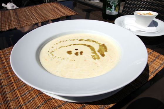 Îmi imaginam că va fi un prânz copios, însă eram pregătită pentru un asemenea festin, având în vedere că nu se întâmplă prea des. Supa a fost servită într-o farfurie largă, decorată frumos cu picături verzui de ulei de măsline. Consistență cremoasă, morcov ras fin, gust dulceag. Am mai adăugat puțină sare și piper, câteva crutoane și am început să savurez mâncarea din farfurie. Față de o supă cremă clasică de țelină, aceasta avea o consistență mai cremoasă și mai lăptoasă. Aroma de brânză era delicată, nu se simțea gustul intens, specific brânzei Roquefort, combinația fiind exact cum îmi place mie. Cantitatea a fost și ea peste așteptări, aproape nu mai simțeam nevoia să trec la felul doi.