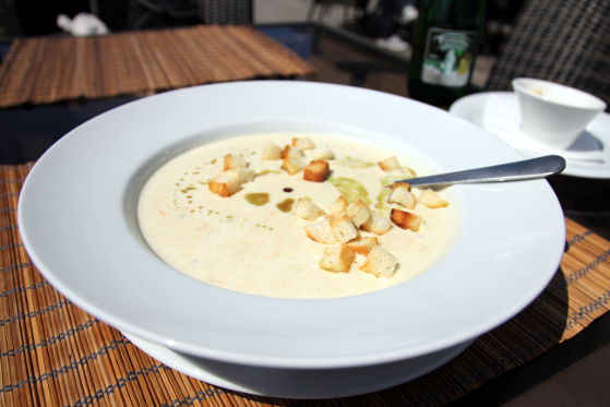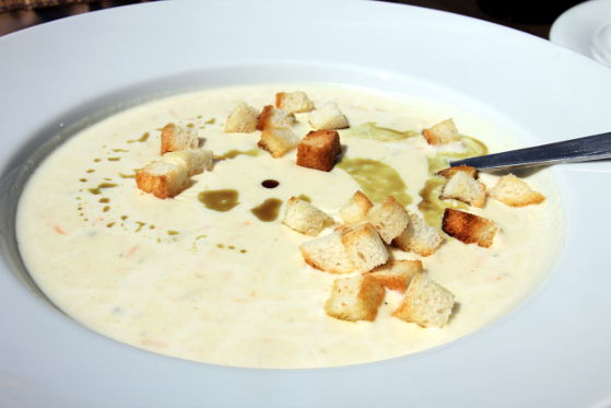 Personalul a venit repede la noi și ne-a servit pentru început cu patru felii de focaccia fierbinte, cât să ne astâmpere puțin foamea. Consultând meniul am putut observa că este foarte variat și cuprinde preparate extrem de rafinate. Fiind o mare fană a combinațiilor dulce-sărat și o amatoare înrăită de brânză, m-am hotărât să încerc o supă cremă de țelină cu brânză Roquefort și un aperitiv cald, Camembert în crustă de migdale cu sos de afine.