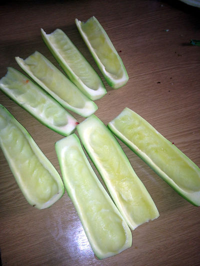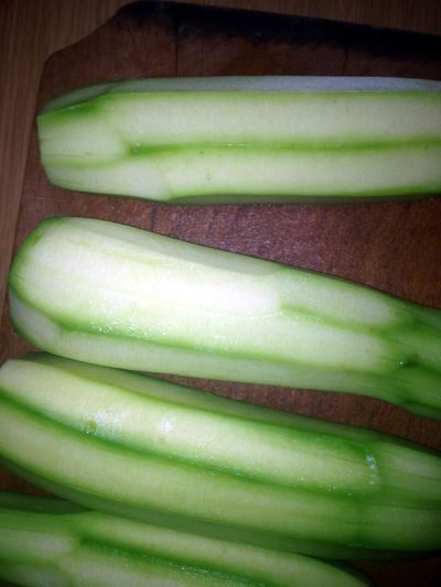 • După ce ciupercile au fost adăugate, se lasă toată compoziția la foc mic pentru a se pătrunde toate aromele. În acest timp se curăță cei 4 dovlecei, se taie în două pe verticală și se scot semințele din interiorul acestora cu ajutorul unei linguri.