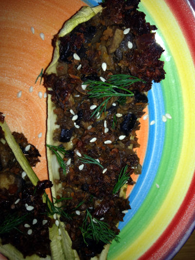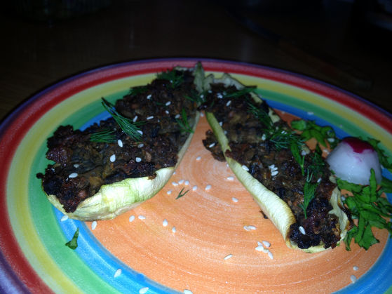 • Se așează în tavă dovleceii și se stropesc și aceștia cu puțin ulei de struguri, apoi se pune compoziția în interiorul acestora și se introduc la cuptor pentru 30 minute.