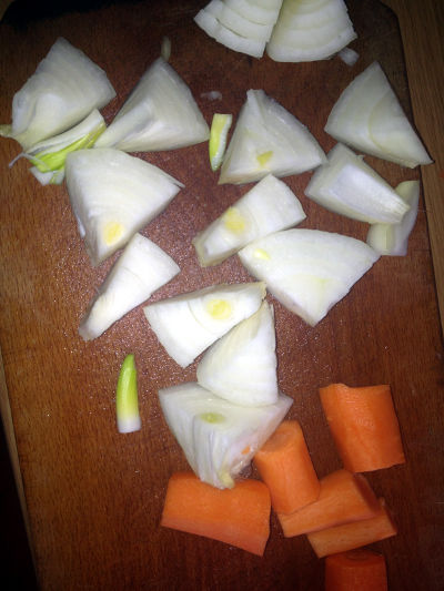 • Se pun în tigaie două linguri de ulei de măsline și se adaugă ceapa. Aceasta se lasă puțin la călit, apoi se adaugă morcovii și sfecla roșie.