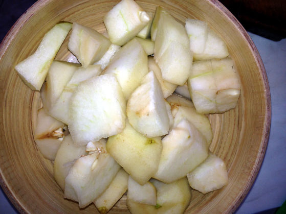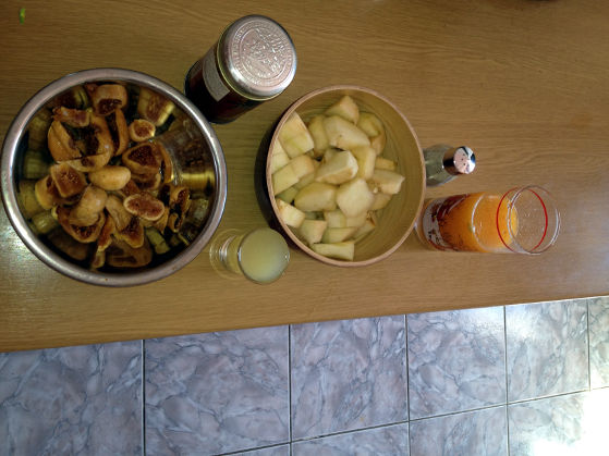 - Separat se curăţă perele şi se taie bucăţele, la fel procedându-se şi cu smochinele, acestea din urmă tăindu-se în două.